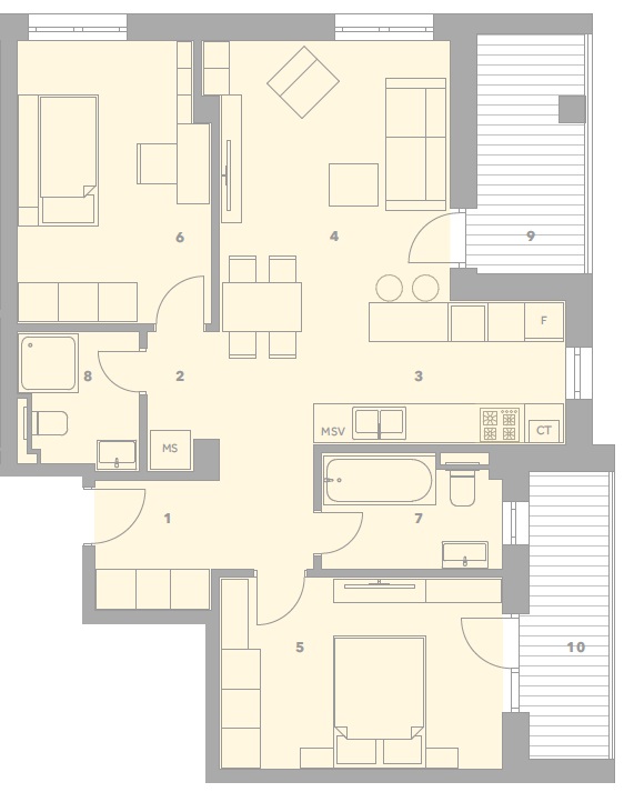 Acest apartament este alcatuit dintr-un hol de acces, 3 camere, o bucatarie deschisa, 2 grupuri sanitare si 2 logii de 6 mp, respectiv 5.44 mp.